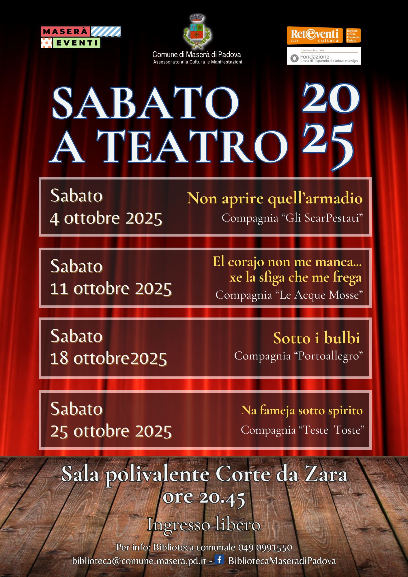 Abbiamo il piacere di portare la nostra commedia “Sotto i Bulbi” alla rassegna organizzata dalla Biblioteca del Comune di Maserà nella serata di sabato 18 ottobre presso l’auditorium della Corte da Zara alle ore 20.45 con ingresso gratuito. Ci auguriamo…